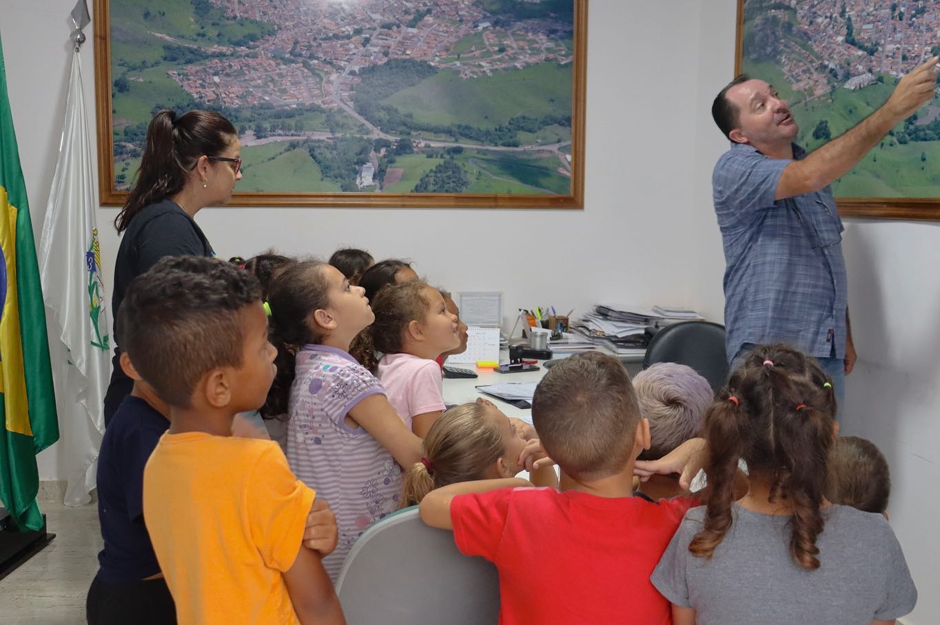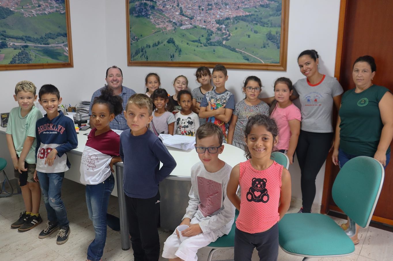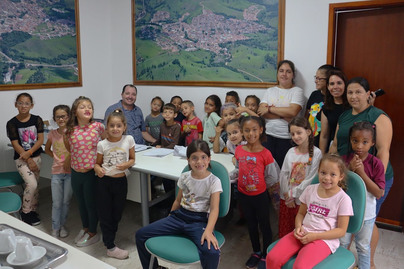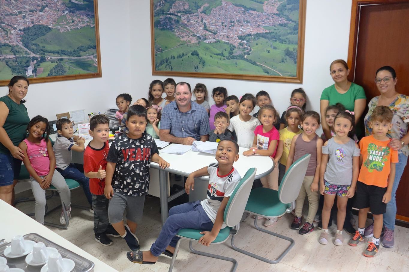 As crianças ficaram super empolgadas com a visita, fizeram perguntas ao prefeito sobre trabalho e rotina, e se divertiram com as fotos aéreas do município nas paredes do local.