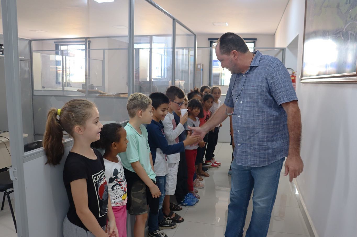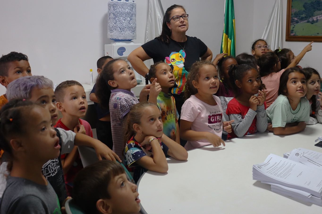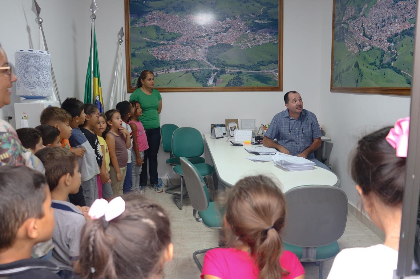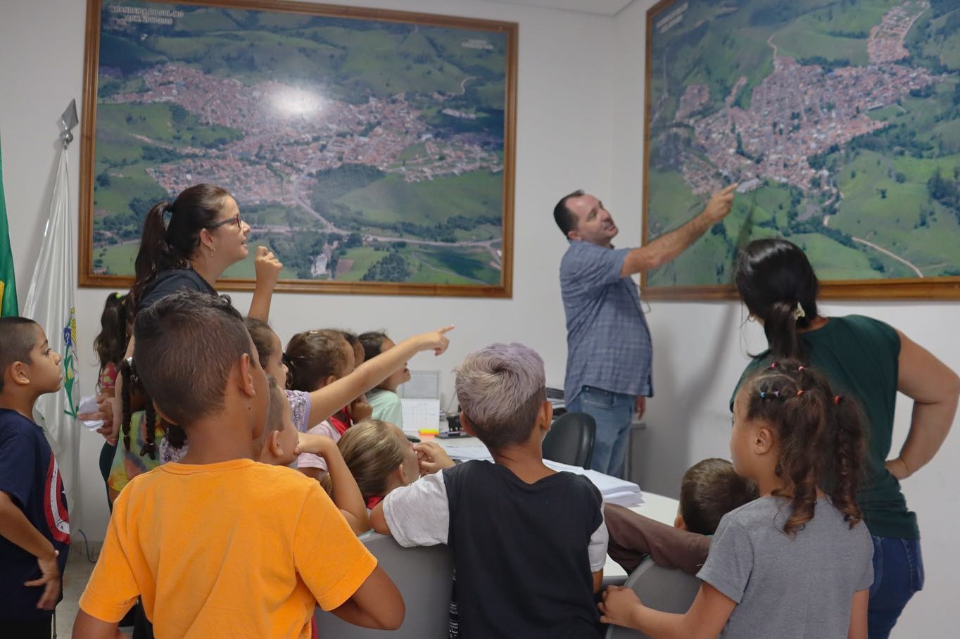 As crianças ficaram super empolgadas com a visita, fizeram perguntas ao prefeito sobre trabalho e rotina, e se divertiram com as fotos aéreas do município nas paredes do local.