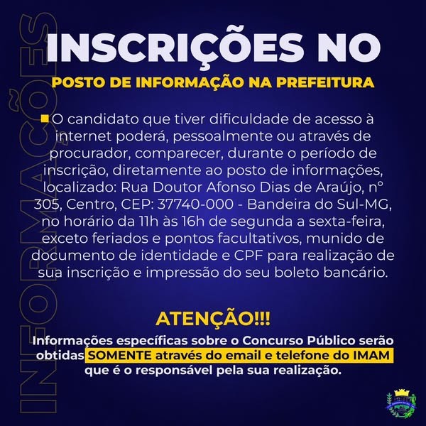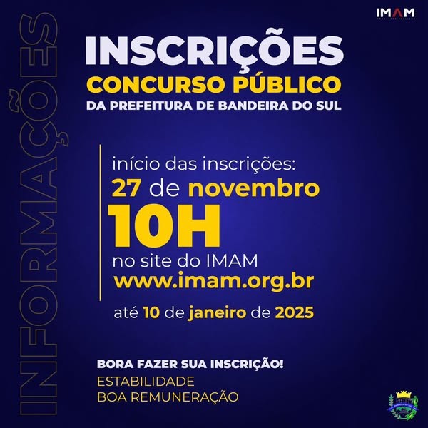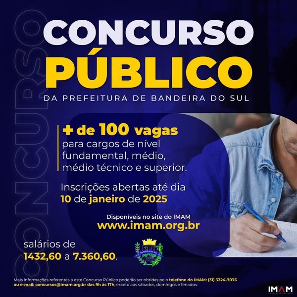 Já começaram as inscrições para o concurso público da Prefeitura Municipal de Bandeira do Sul, que vão até o dia 10 de janeiro de 2025.