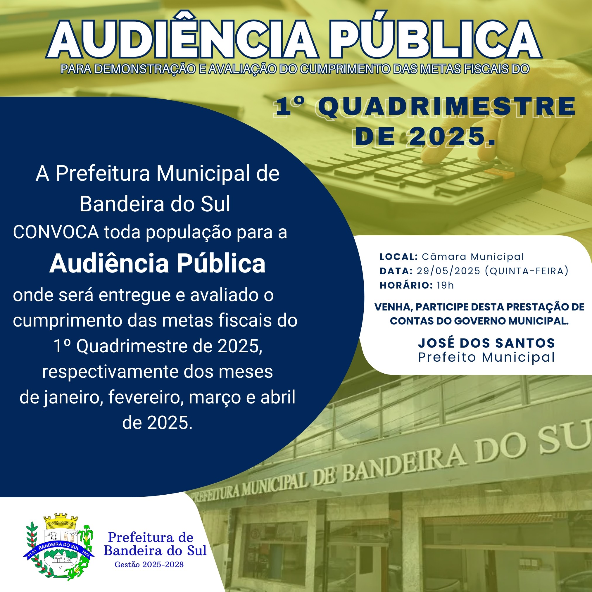 A Prefeitura Municipal de Bandeira do Sul convida toda a população para participar da Audiência Pública de demonstração e avaliação do cumprimento das metas fiscais referentes aos meses de janeiro, fevereiro, março e abril de 2025.