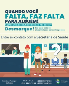 Quando você agenda e não comparece a uma consulta ou exame, outra pessoa que está esperando pode perder a chance de ser atendida mais cedo.
