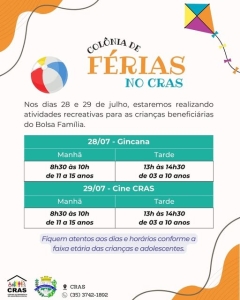 Nos dias 28 e 29 de julho, o CRAS vai promover atividades recreativas para as crianças beneficiárias do Bolsa Família!