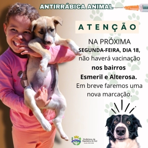 Na próxima segunda-feira, dia 18, não haverá vacinação antirrábica nos bairros Esmeril e Alterosa.