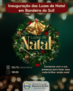 A Prefeitura Municipal convida toda a população para a Inauguração das Luzes de Natal, que acontecerá nesta sexta-feira, dia 05 de dezembro, às 18h30, na praça central.