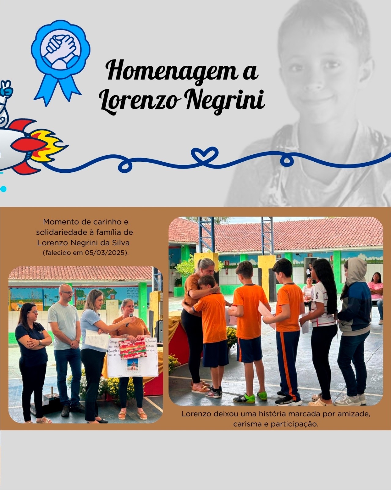 Ainda na mesma data, foi realizado um comovente momento de homenagem à memória de Lorenzo Negrini da Silva, ex-aluno da escola anfitriã, falecido em 05 de março de 2025. Sua genitora, Fabiana Negrini da Costa, esteve presente e recebeu o carinho e a solidariedade das crianças e dos servidores.