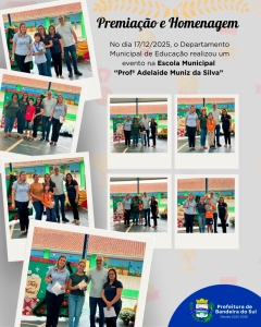 No dia 17 de dezembro de 2025, o Departamento Municipal de Educação realizou um evento de premiação e homenagem, ocorrido na Escola Municipal “Profª Adelaide Muniz da Silva”, que atende ao Ensino Fundamental (anos iniciais), contemplando ambos os turnos letivos.