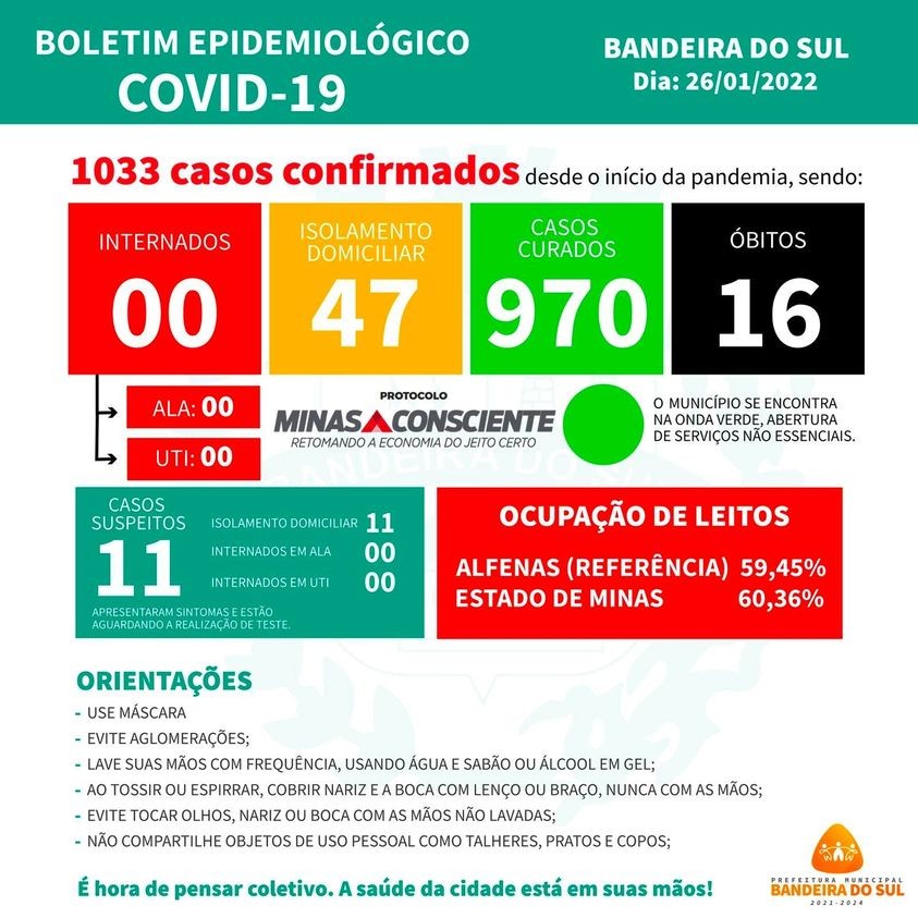 O município de Bandeira do Sul, deve seguir os protocolos de restrição conforme a ONDA VERDE no programa Minas Consciente.