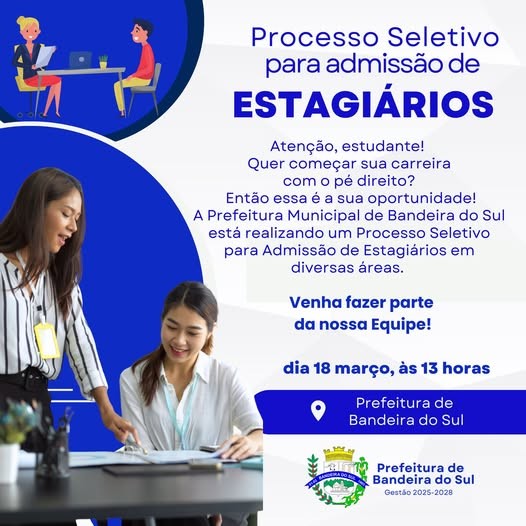 A Prefeitura Municipal de Bandeira do Sul está com inscrições abertas para o Processo Seletivo de Estagiários!