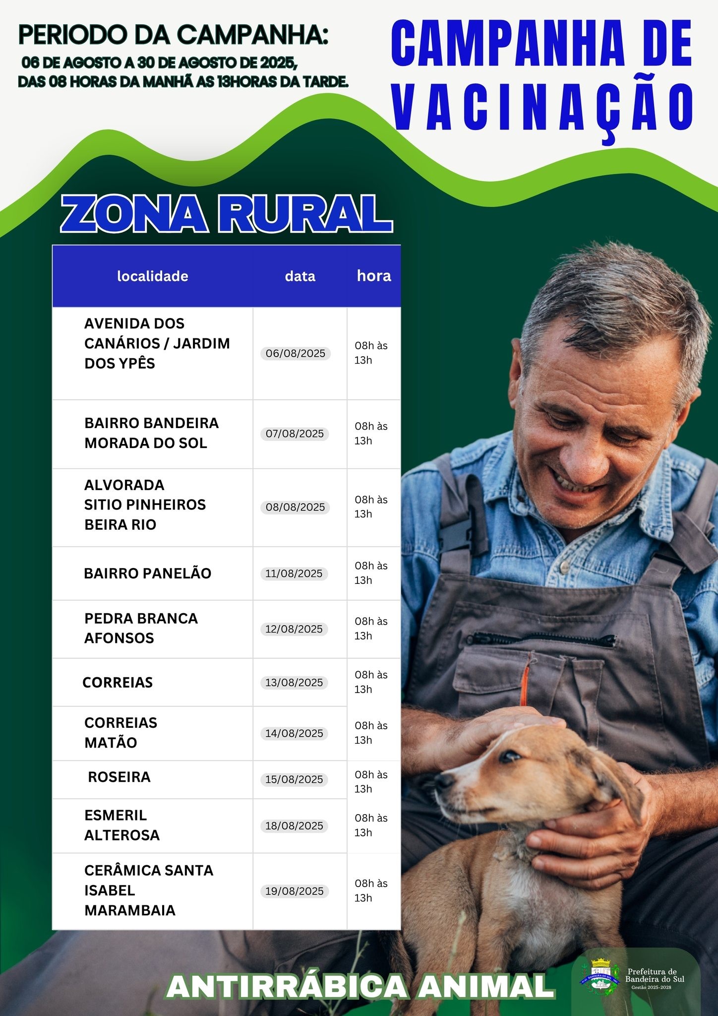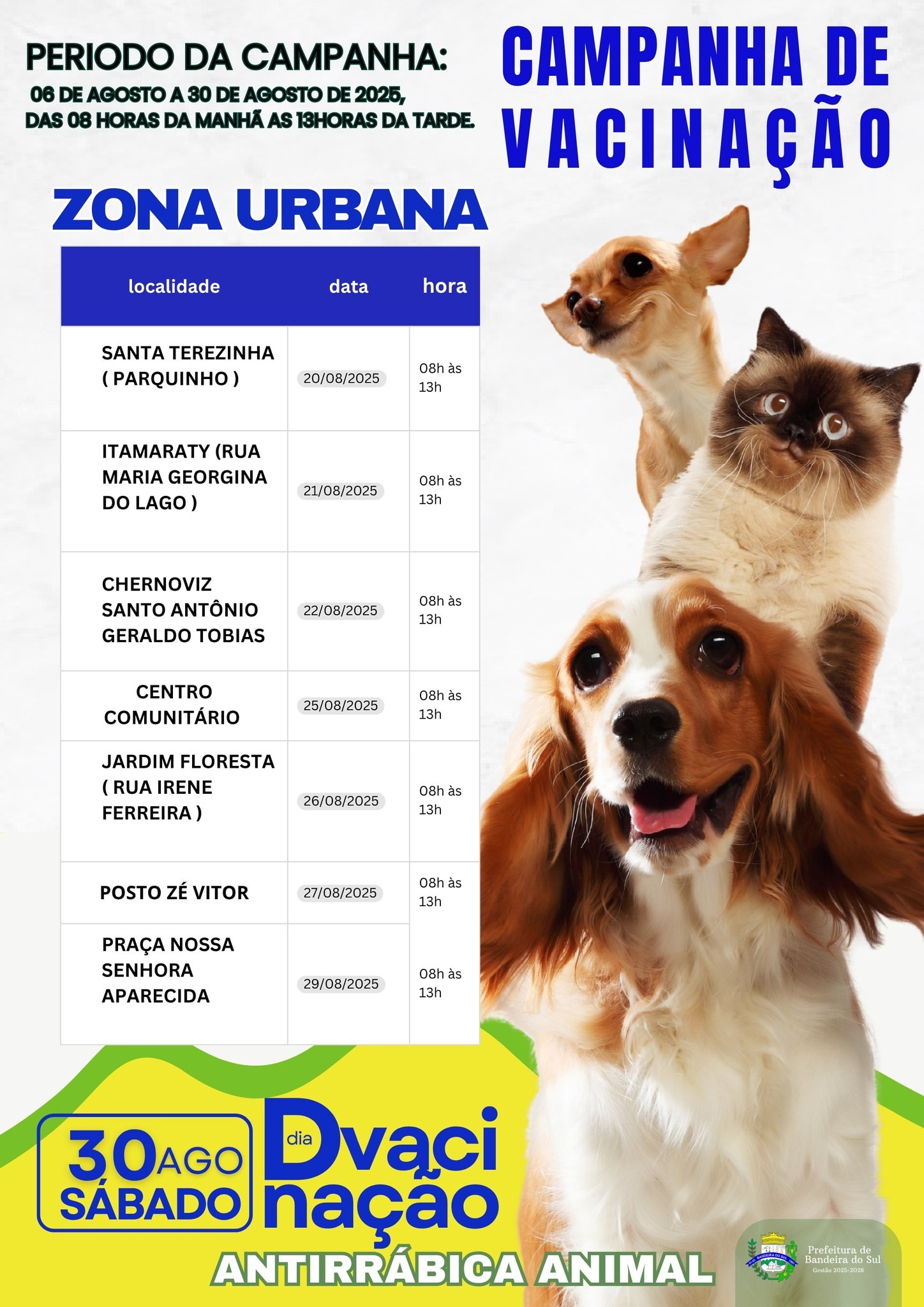 A Campanha de Vacinação Antirrábica terá início nesta quarta-feira, dia 06 de agosto, e seguirá até o dia 30 de agosto de 2025, com a vacinação de cães e gatos em diversos bairros e comunidades.